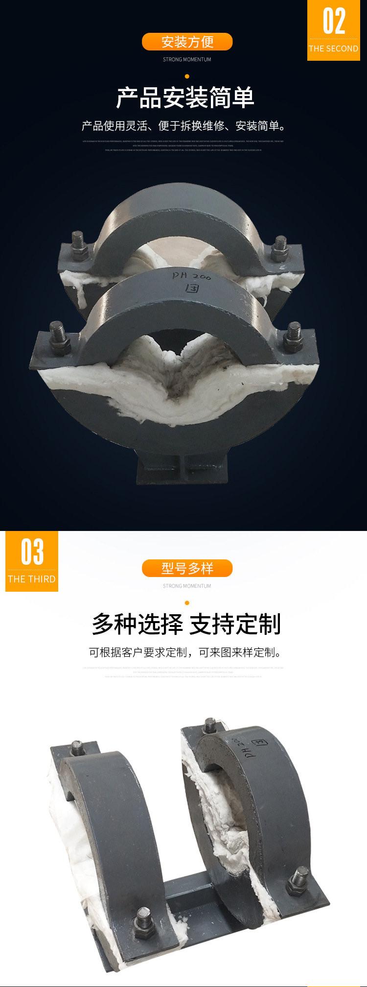 絕熱滑動管托獨有的呼吸技術,在杜絕負壓的前提下,蒸汽管道隔熱管托,防止內部水分的累積,以及在高溫,低溫溫變交替的過程中等形成的弊端,避免了保溫保溫一體板的隱患。 防掉皮,防脫落,防連帶,防火防雷防震;每兩年定期檢查,系統設計,高溫管道還是低溫管道的管托,不僅要求具有支承強度,而且要求具有隔熱性和耐燃性。