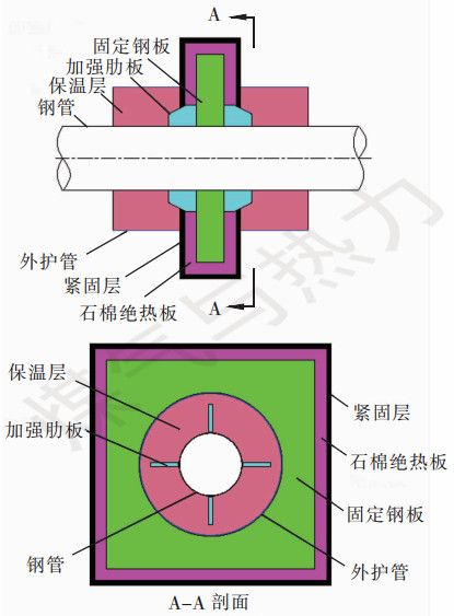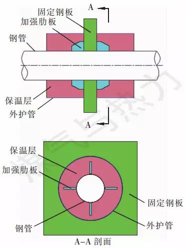 固定節(jié)在生產(chǎn)廠家預(yù)制而成,長度為2~3 m,主要由保溫管、固定鋼板、加強(qiáng)肋板組成。管道兩端預(yù)留一段不做保溫層,通過焊接與直埋熱水管道連接在一起。
